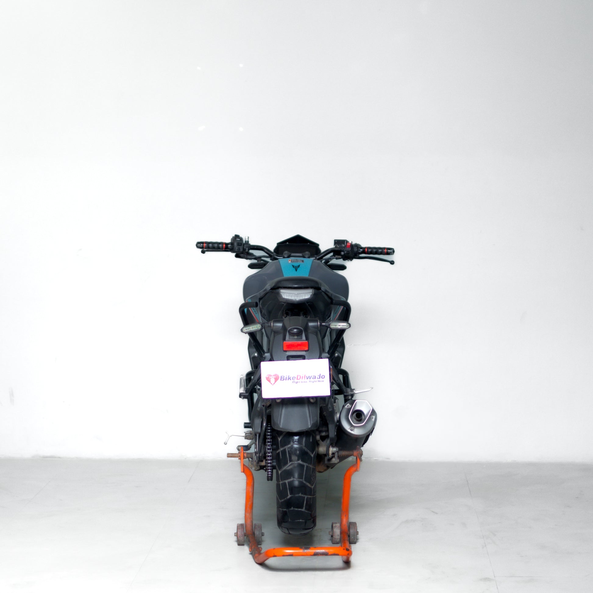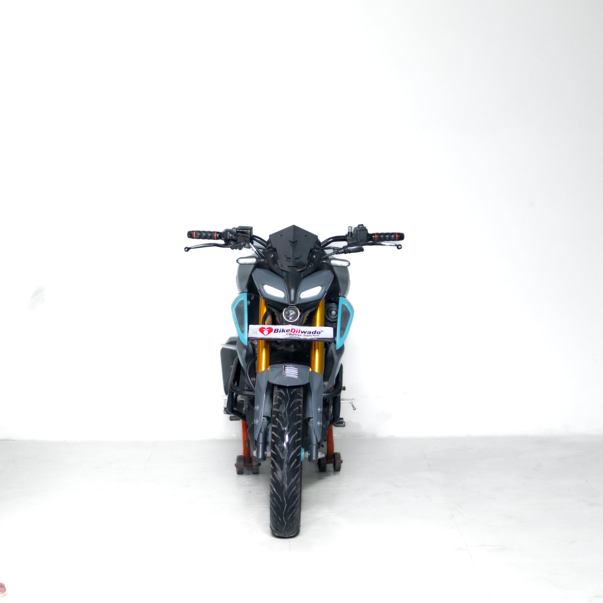 used mt 15 gurgaon Black motorcycle with blue wheels on a white background